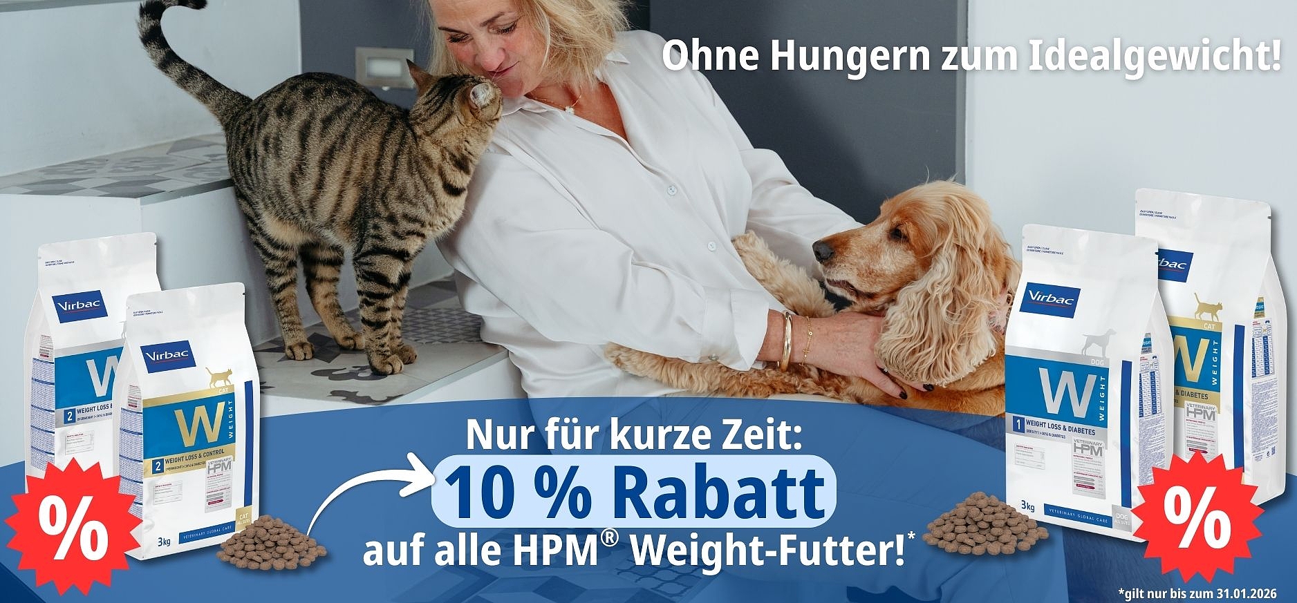 Wir empfehlen dir unsere Veterinary HPM® Weight Futter (W1 / W2) für Hunde und Katzen, die entweder eine starke Gewichtsreduktion oder eine mäßige Abnahme bestmöglich unterstützen.